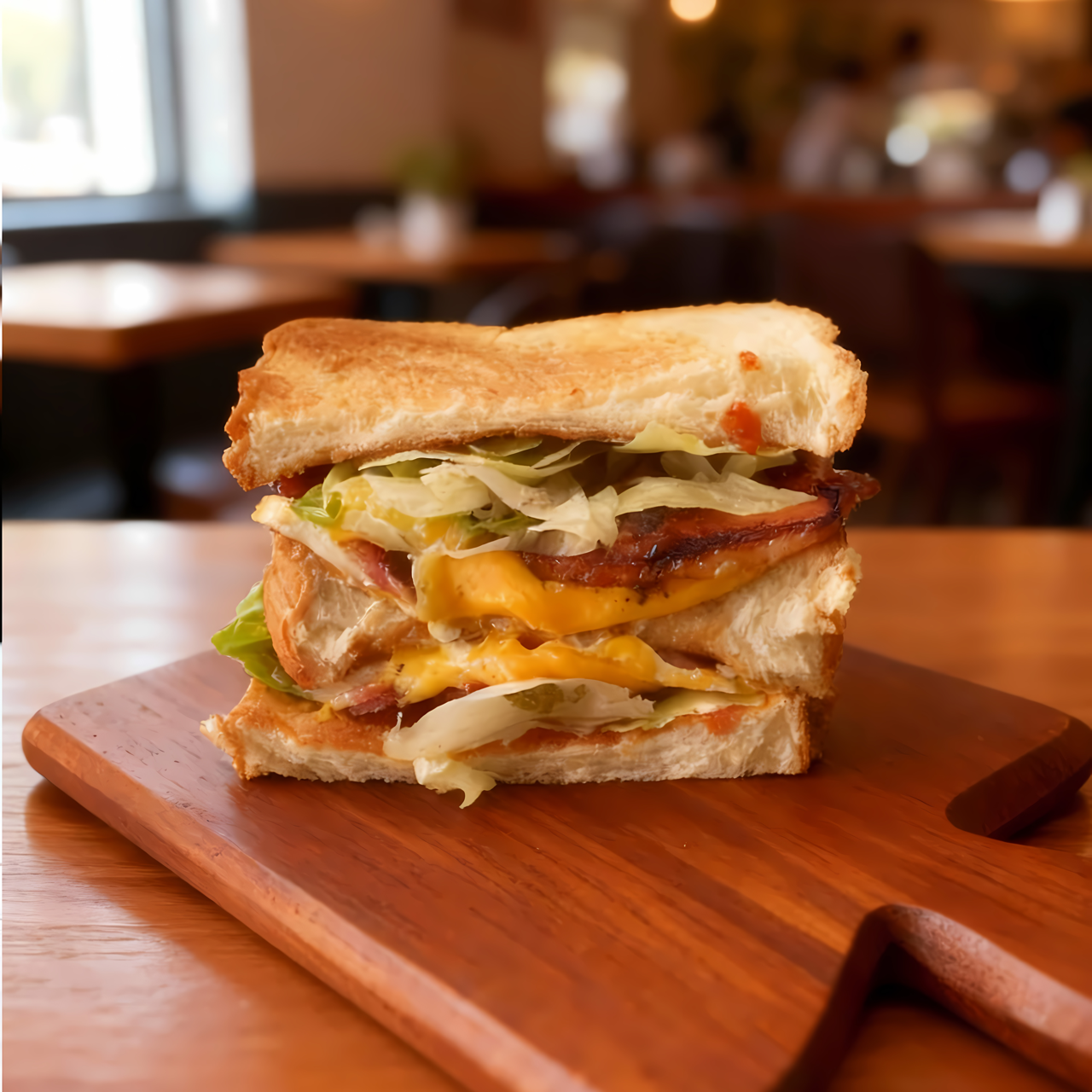 Your loyal breakfast ally, bacon, egg, and molten cheddar united in golden toast.