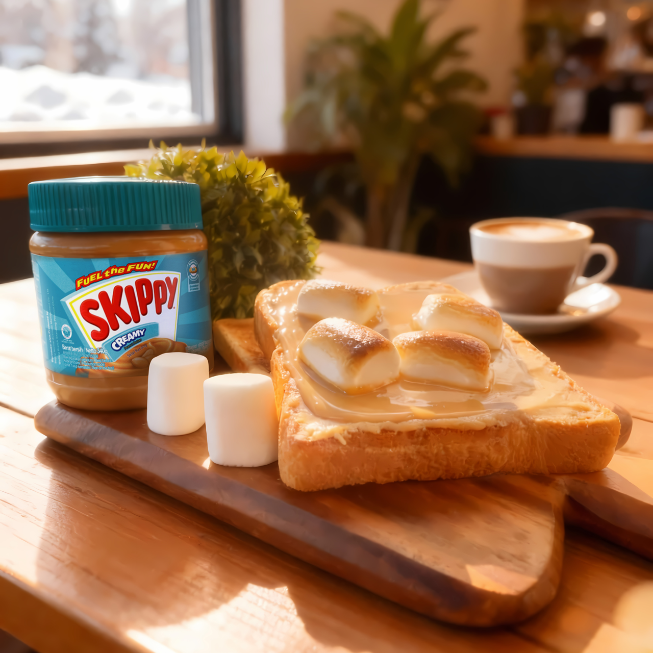 Fluffy marshmallows resting on warm peanut butter, sweet as a bedtime story.